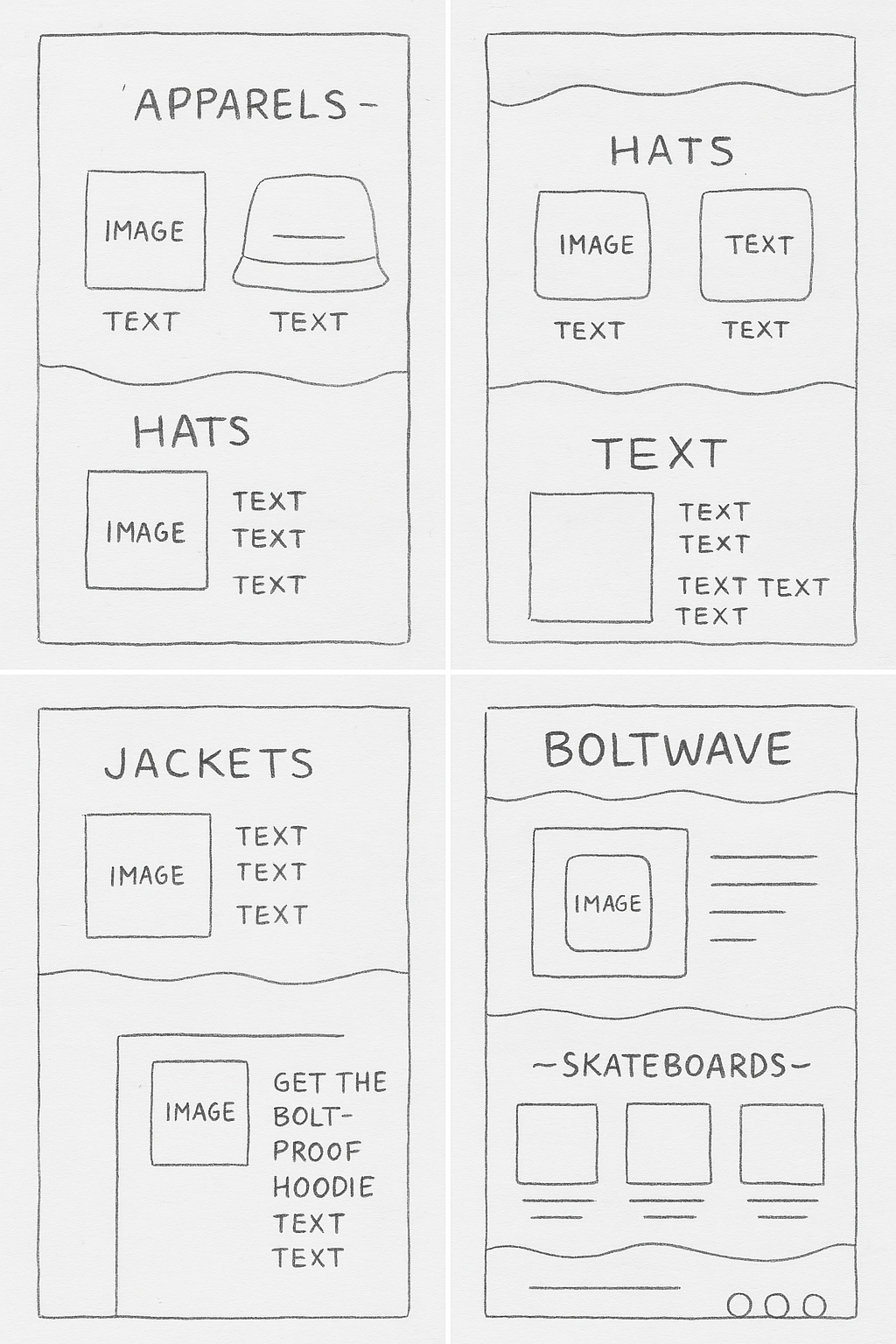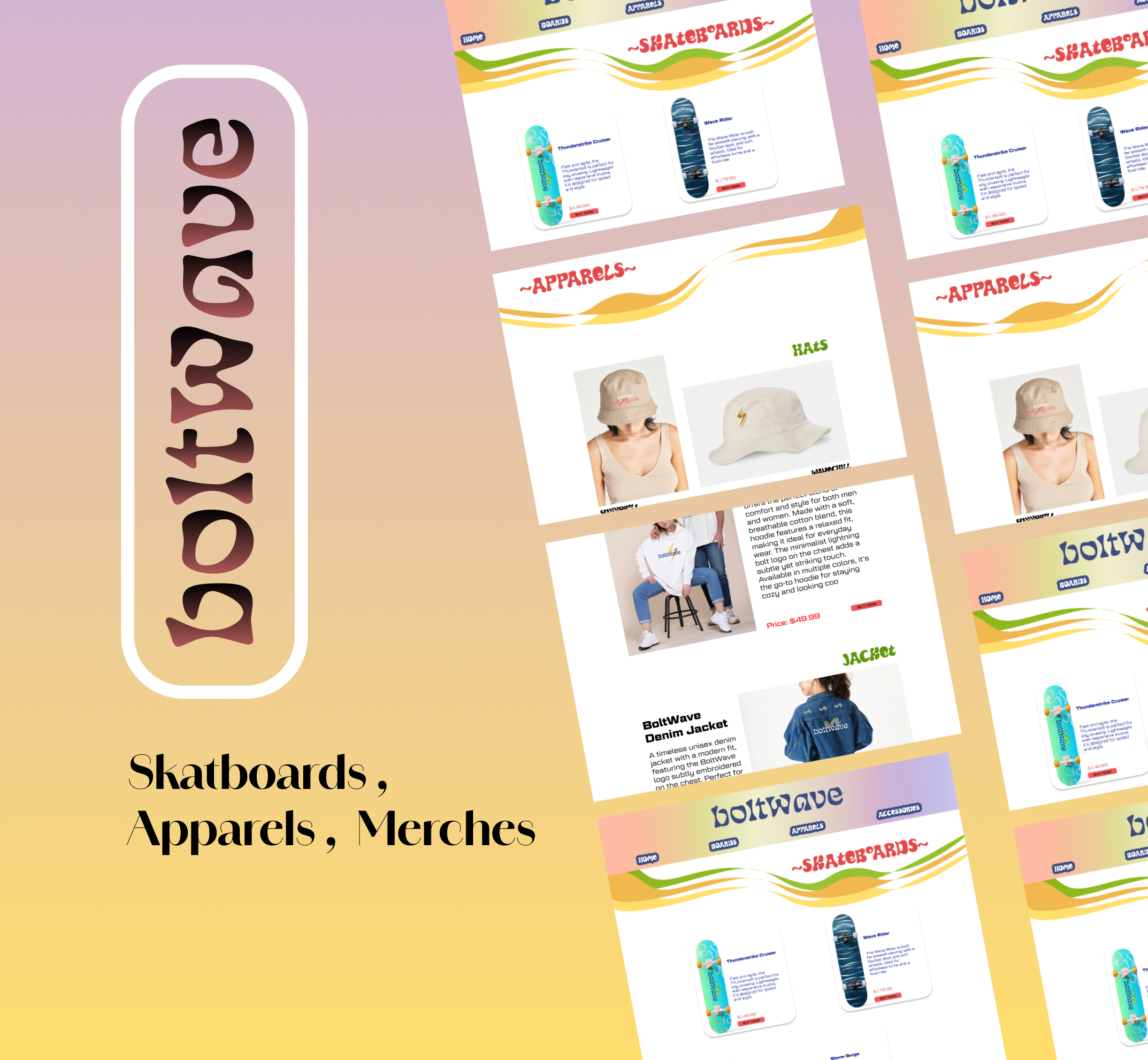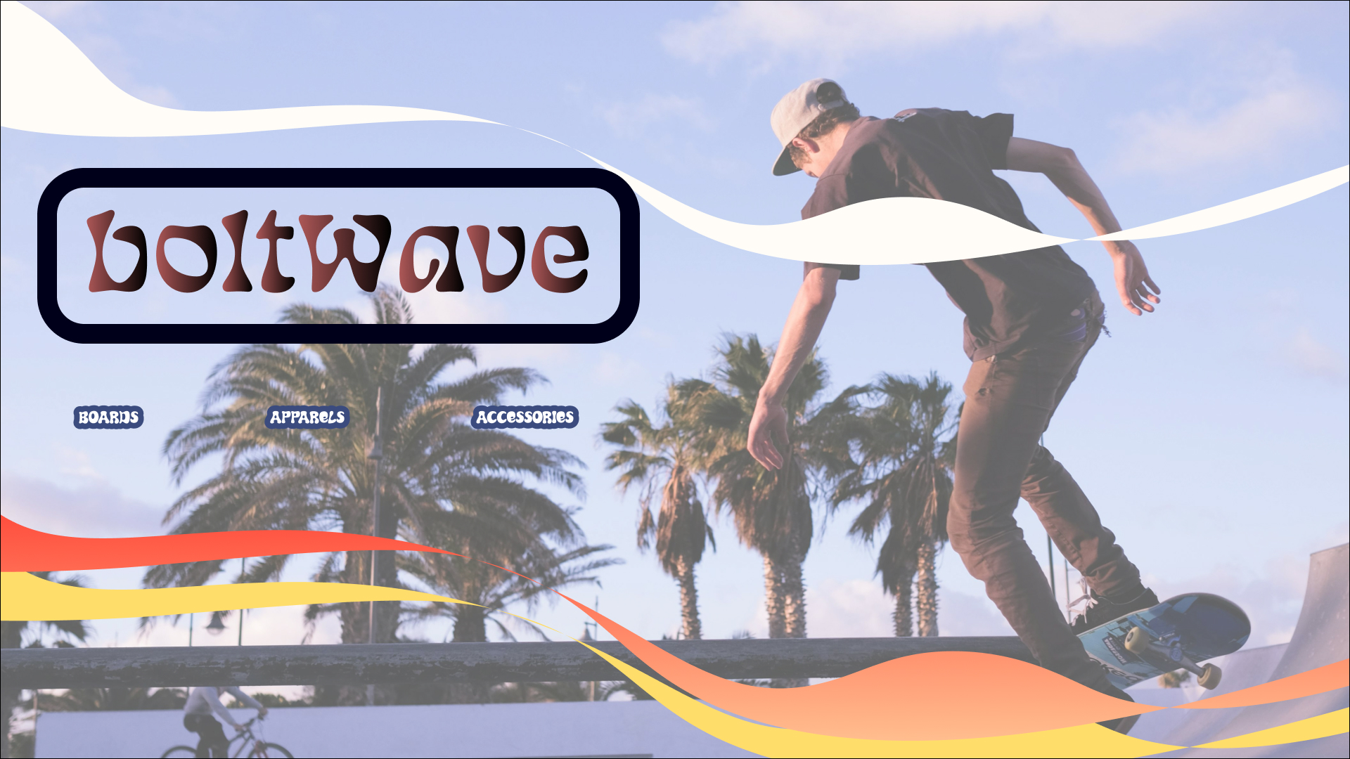 The Boltwave project started with research into extreme sports branding and cultural aesthetics. From there, a motif and wordmark were developed through multiple rounds of sketching and refinement. Once the core visual identity was solidified, board and apparel graphics were designed to echo the brand’s edgy, fast-paced vibe. The final phase involved creating a responsive Figma mockup, layering assets thoughtfully into a clean, user-friendly layout that tied the entire Boltwave brand together visually and interactively.