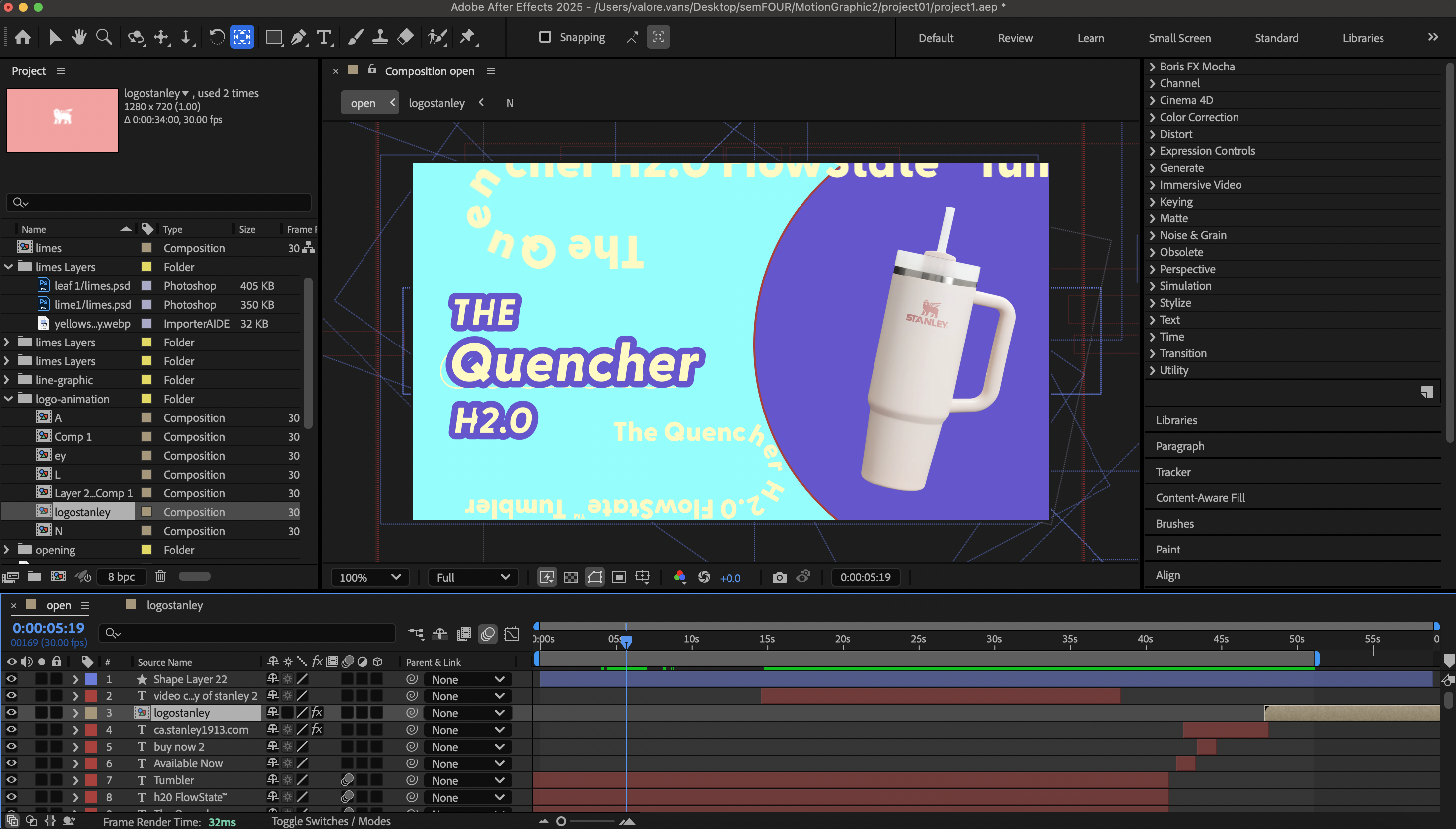 The final deliverables for the Stanley Tumbler Product Demo include: High-Quality Product Demo Video – A professionally edited motion graphics video showcasing the Stanley tumbler’s features, benefits, and design. Storyboard & Concept Breakdown – A structured visual guide detailing the animation flow and key messaging points. Motion Graphics Assets – Custom-designed elements such as transitions, text animations, and 3D renders used in the video. Video Formats & Optimizations – The final video is provided in multiple formats (MP4, MOV) for web, social media, and presentation use. Project Files – Editable After Effects (or relevant software) files, allowing future updates or modifications. Brand Integration – Ensuring consistency with Stanley’s branding through colors, typography, and style. Demo Presentation – A short presentation or pitch deck summarizing the video’s purpose, creative process, and final execution.