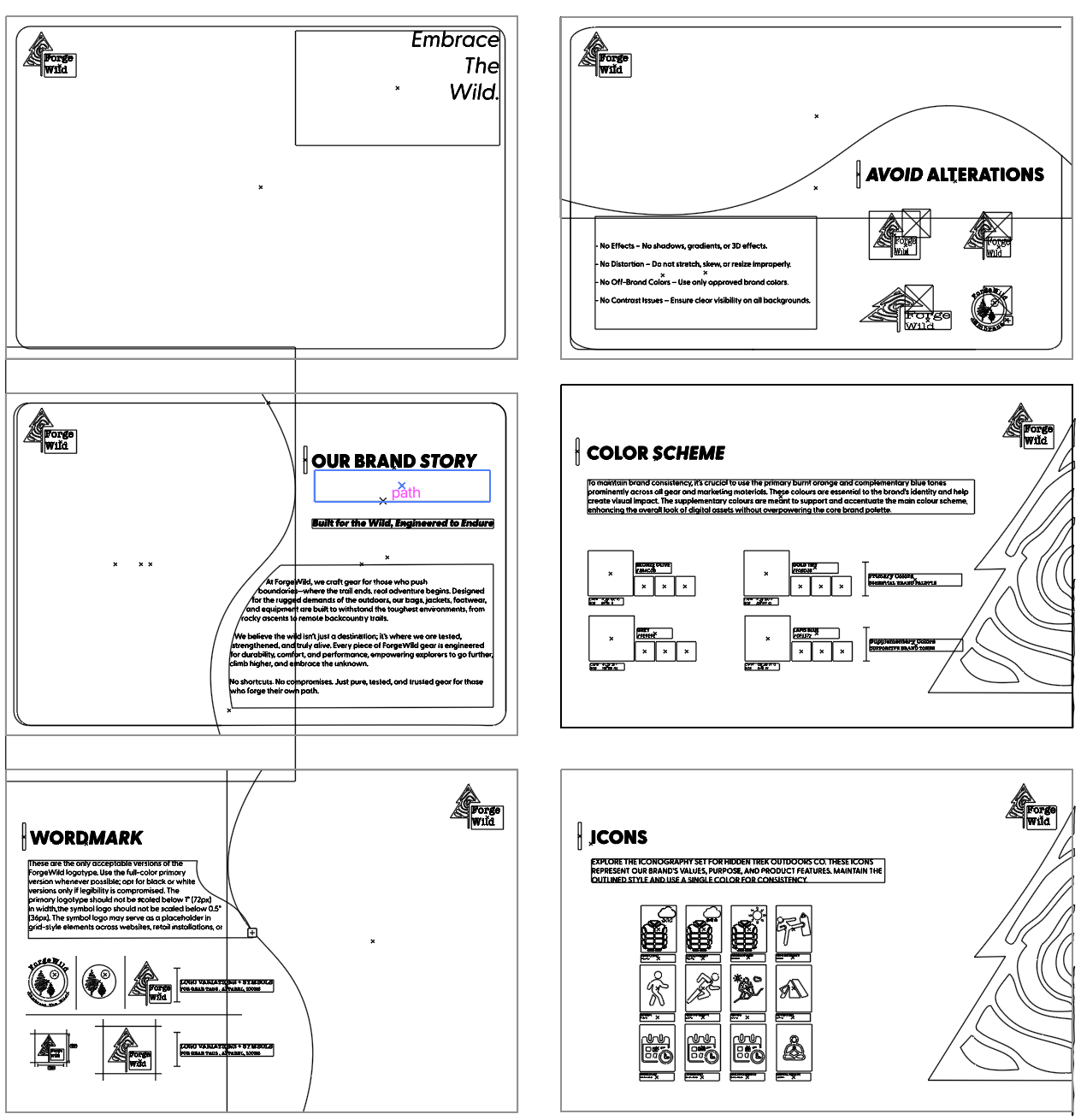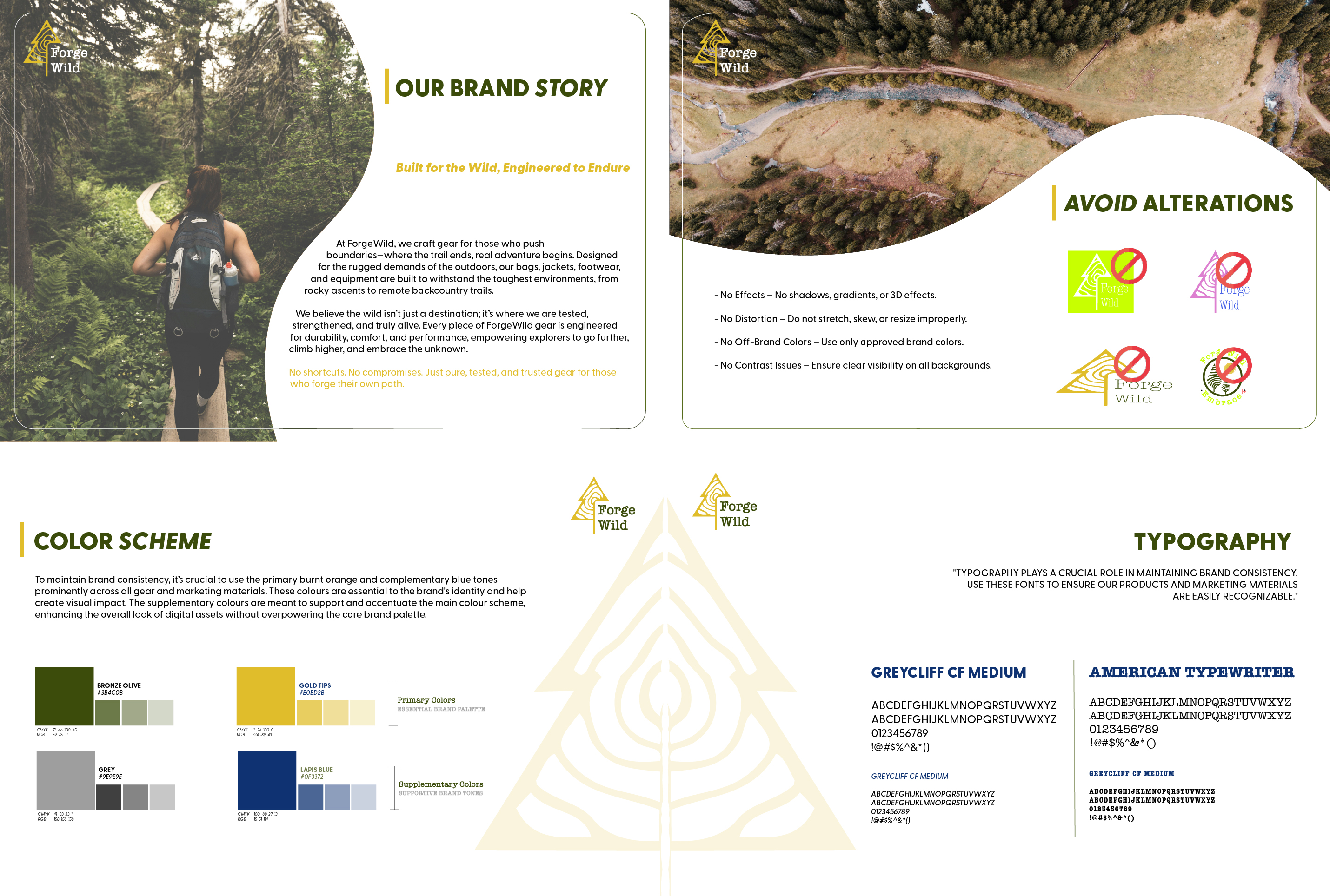Creating the ForgeWild Gear Company Brand Book involved in-depth research and strategic design to align with the brand’s rugged identity. The process began with analyzing ForgeWild’s mission and target audience, ensuring the visuals and messaging resonated with outdoor enthusiasts. From there, key brand elements—logo, typography, color palette, and imagery—were carefully selected to reflect durability and adventure. Iterative refinement and feedback shaped a cohesive, polished brand book that reinforces ForgeWild’s presence in the outdoor gear market.