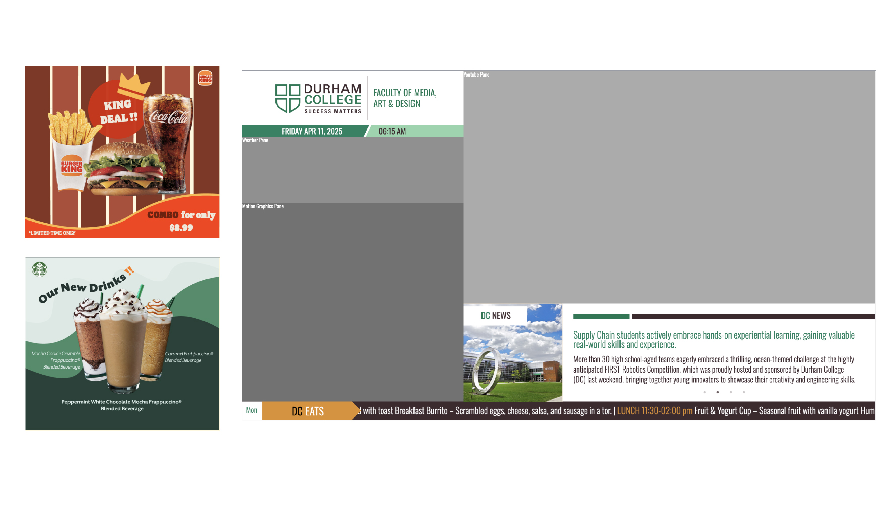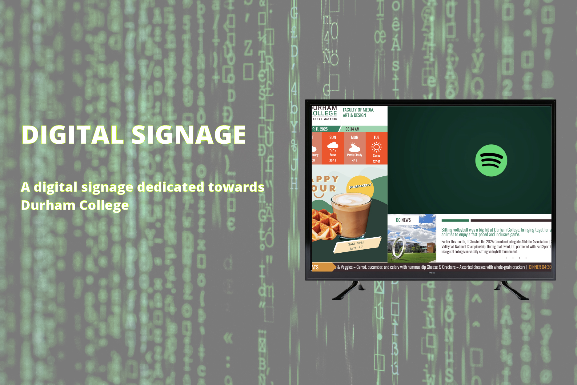 The project started with concept development and audience analysis to determine the content needs for each video. Motion graphics were storyboarded and animated to align with each brand’s tone—Spotify’s being bold and energetic, Odmines’ more modern and tech-focused, and Durham College’s PSA informative yet emotionally resonant.Once the animations were finalized, I structured the web interface using HTML for layout, CSS for styling and responsiveness, and JavaScript to control video playback logic, transitions, and timing. The digital signage cycles through the three videos seamlessly, using timed intervals or interactive triggers (if needed) to ensure an engaging and continuous experience. Responsive design principles were applied to ensure compatibility with different screen sizes and resolutions.